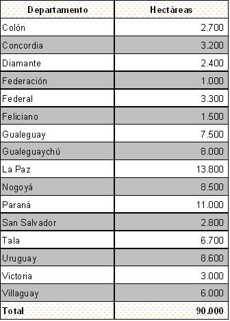 Los departamentos La Paz, Paraná, Uruguay y Gualeguaychú abarcan 41.300 ha hecho que representa el 46% del total cultivado.