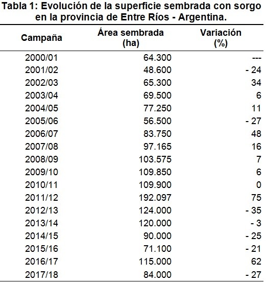 Los datos estadísticos sobre la evolución del área implantada con sorgo en Entre Ríos se presentan en la Tabla 1.