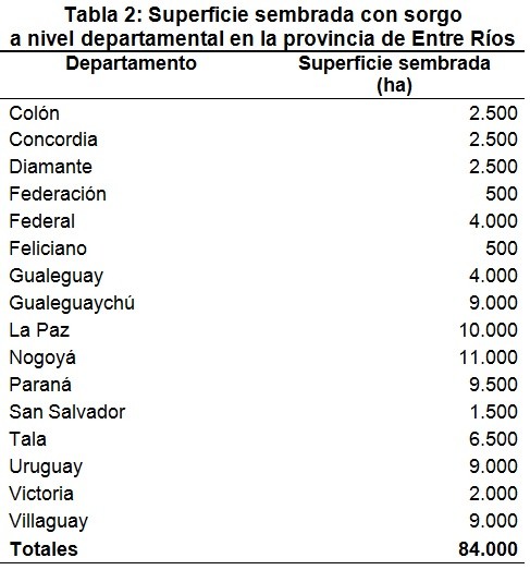 La superficie sembrada con sorgo a nivel departamental se encuentra detallada en la Tabla 2.
