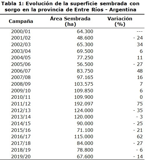 Los datos estadísticos sobre la evolución del área implantada con sorgo en Entre Ríos se presentan en la Tabla 1.