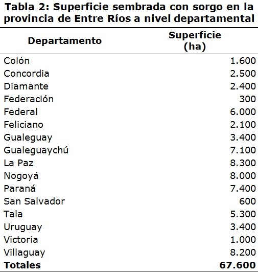 Los datos estadísticos sobre la superficie implantada con sorgo a nivel departamental se presentan en la Tabla 2.