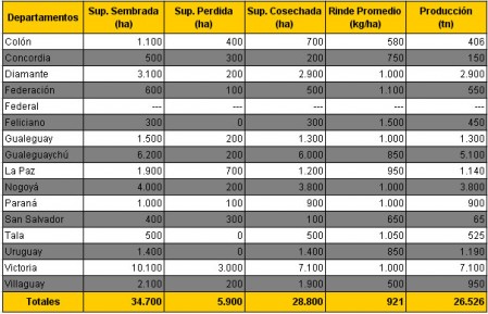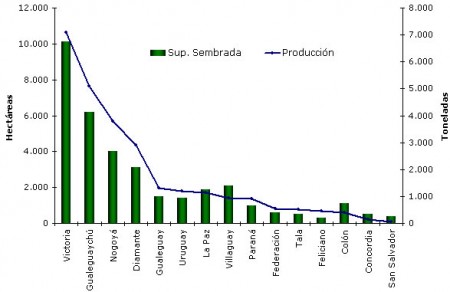 El departamento Victoria se ubicó en el primer lugar en lo referente a superficie sembrada como a lo que producción se refiere, ya que tuvo 10.100 ha y logró 7.100 toneladas; que representan el 29,1% de los sembrado y el 26,8% de lo producido.