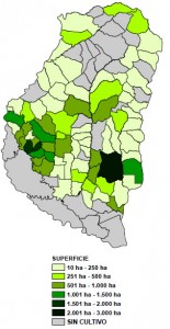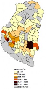 Estos tres departamentos abarcaron el 58,5% de lo sembrado (20.300 ha) y el 60,3% de lo producido (16.000 tn), ver Gráfico 1.