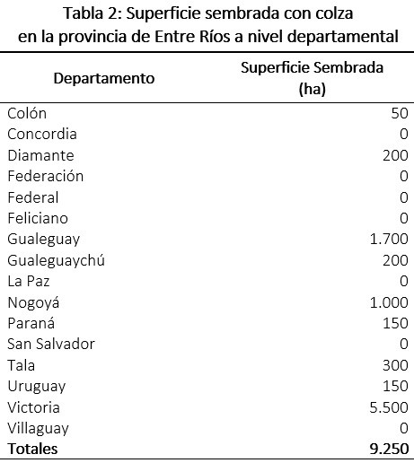 Los datos estadísticos sobre la superficie implantada con colza a nivel departamental se presentan en la Tabla 2.