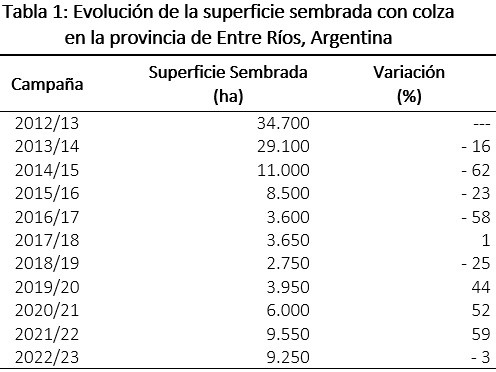 Los datos estadísticos sobre la evolución del área implantada con colza en Entre Ríos se presentan en la Tabla 1.