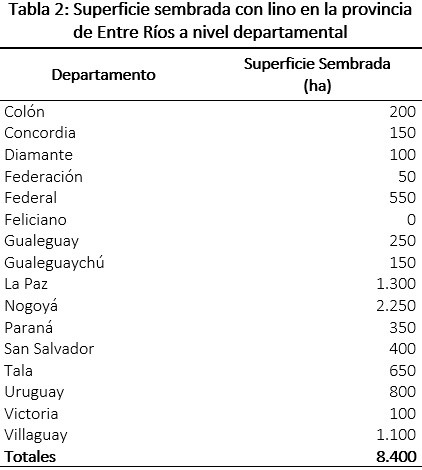 Los datos estadísticos sobre la superficie implantada con lino a nivel departamental se presentan en la Tabla 2.