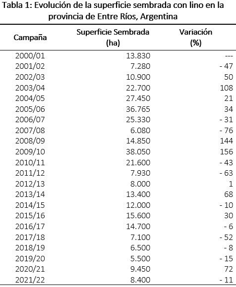 En la Tabla 1 se muestran los datos estadísticos sobre la evolución del área dedicada a la siembra de lino en la provincia de Entre Ríos.