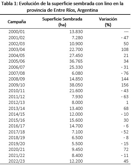 En la Tabla 1 se muestran los datos estadísticos sobre la evolución del área dedicada a la siembra de lino en Entre Ríos.