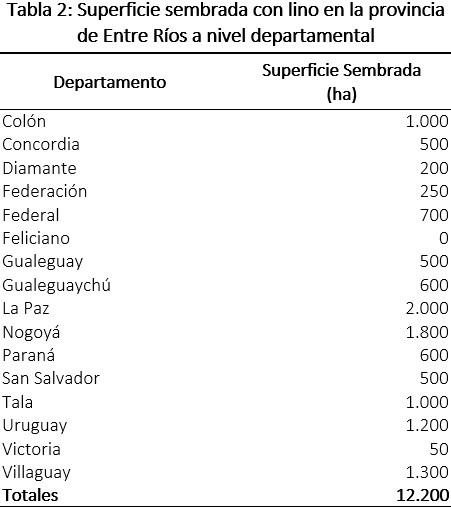 Los datos estadísticos sobre la superficie implantada con lino a nivel departamental se presentan en la Tabla 2.