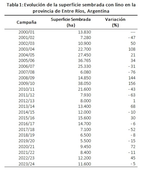 En la Tabla 1 se muestran los datos estadísticos sobre la evolución del área dedicada a la siembra de lino en Entre Ríos.