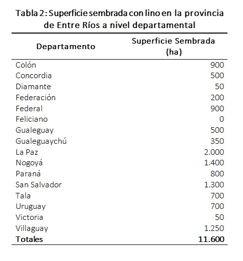 Los datos estadísticos sobre la superficie implantada con lino a nivel departamental se presentan en la Tabla 2.