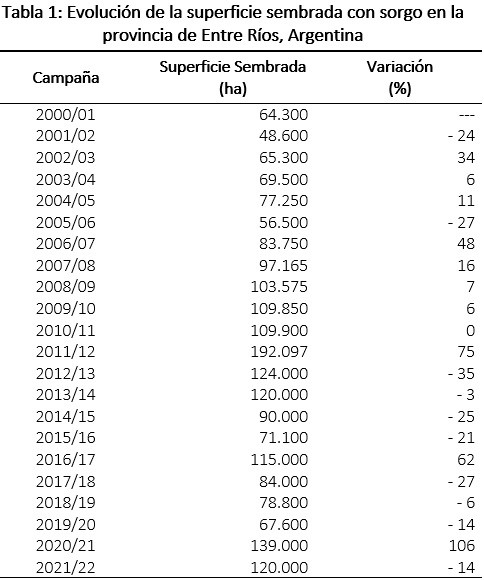 Los datos estadísticos sobre la evolución del área implantada con sorgo en Entre Ríos se presentan en la Tabla 1.