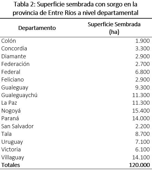 Los datos estadísticos sobre la superficie implantada con sorgo a nivel departamental se presentan en la Tabla 2.
