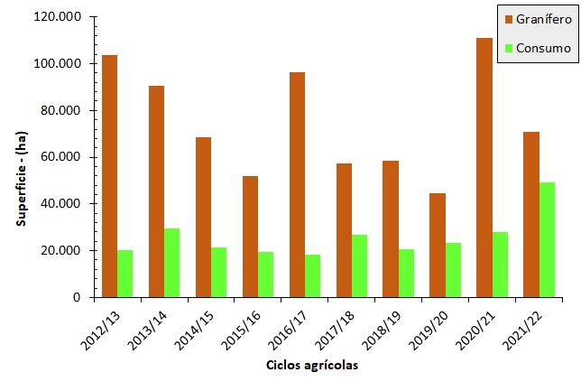 En el ciclo 2021/22 el sorgo tipo granífero abarcó 70.700 ha, mientras que el destinado a consumo fue de 49.300 ha.