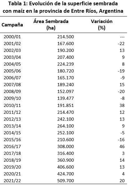 Los datos estadísticos sobre la evolución del área implantada con maíz en Entre Ríos se presentan en la Tabla 1.