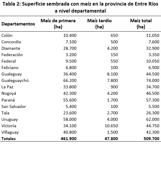 Los datos estadísticos sobre la superficie implantada con maíz a nivel departamental se presentan en la Tabla 2.