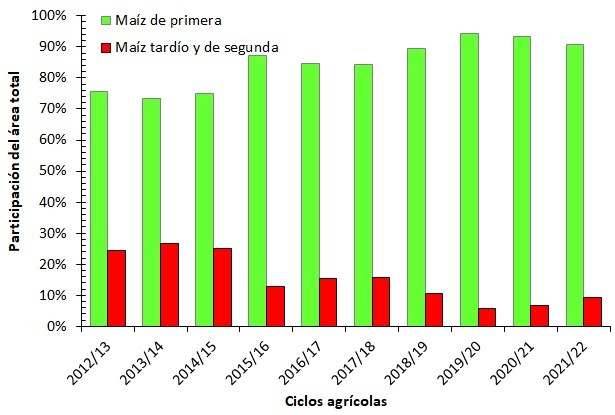 EVOLUCIÓN DE LA PARTICIPACIÓN DEL MAÍZ DE PRIMERA VERSUS MAÍZ TARDIO Y DE SEGUNDA