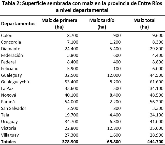 Los datos estadísticos sobre la superficie implantada con maíz a nivel departamental se presentan en la Tabla 2.