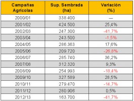 La presente campaña tuvo un comportamiento similar a lo experimentado en el ciclo 2002/03, donde el área se redujo en 177.200 ha; sin embargo hace 10 años el área superaba ampliamente lo implantado actualmente (247.300 ha versus 163.700 ha).