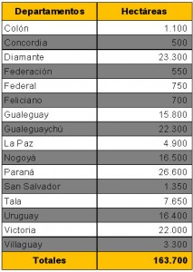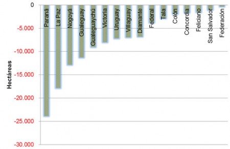 En tercer y cuarto lugar se encuentran Nogoyá y Gualeguay, los cuales han experimentado una disminución de 12.877 ha y 11.268 ha respectivamente.