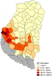 El distrito Palmar (Dpto. Diamante) además de contar con el mayor número de hectáreas, también posee la máxima participación del cereal en relación con el área total del distrito, ocupando entre el 20% y 25% de su superficie.
