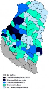La categoría nominada como “Disminución Muy Importante” engloba a los distritos Quebracho y Tala (Dpto. Paraná) y Crucecitas (Dpto. Nogoyá), en los mismos la caída de la superficie oscila alrededor de 6.500 ha.