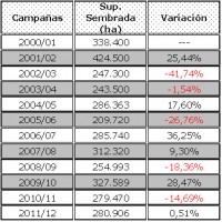 En la Tabla 1 puede observarse la evolución de la superficie implantada en la provincia a partir de la campaña 2000/01 hasta la actual.