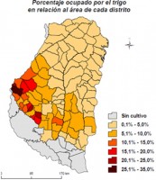 El Mapa 2 presenta el porcentaje que ocupa el cultivo de trigo en relación con la superficie en cada distrito, clasificados en 7 categorías.