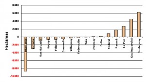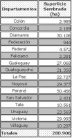 Diamante y Victoria fueron los departamentos con una reducción muy significativa del área, 8.715 y 2.962 ha respectivamente. En la vereda de enfrente se ubican Gualeguay con un incremento de 6.279 ha y Gualeguaychú con 4.589 ha.