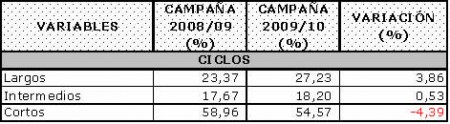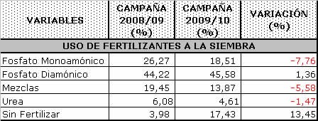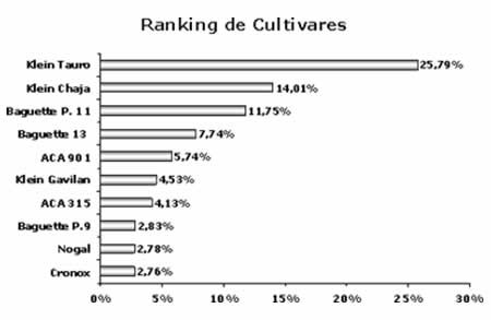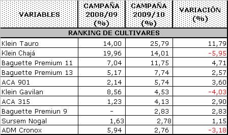 El siguiente gráfico detalla como se posicionan los diez cultivares más utilizados en la campaña 2009/10, los cuales abarcan el 82.06% de lo encuestado, estableciéndose en el cuadro la comparación de ellos con el ciclo agrícola anterior.