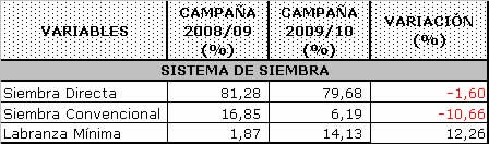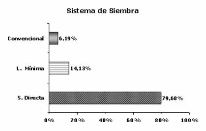 La producción de trigo se realiza mayoritariamente bajo el sistema de “Siembra Directa”, aunque se detectó una insignificante disminución con respecto al ciclo agrícola pasado; por otra parte es significativa la merma en el uso del Sistema Convencional y el aumento en “Labranza mínima”.