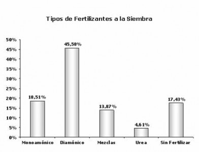El 82.57% de las hectáreas encuestadas recibieron fertilización al momento de la implantación, convirtiéndose el fosfato diamónico como el de mayor preferencia totalizando el 45.58% de la muestra. Por otra parte, se verificó un aumento de 13.45 % en el área que no fue fertilizada.