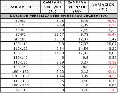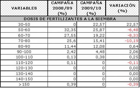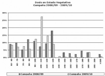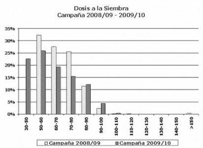 El rango de dosis de mayor uso fue el ubicado entre 100 – 110 Kg/ha, mientras que el año anterior la dosis más utilizada fue de 120 – 130 Kg/ha.