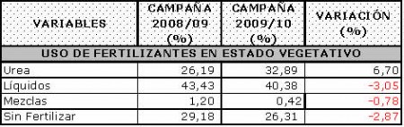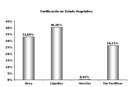 La fertilización nitrogenada aplicada al cultivo en estado vegetativo abarcó el 73.69% de los casos relevados, registrándose un aumento en la utilización de Urea.