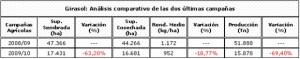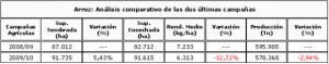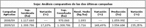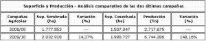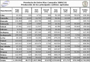 Si bien en la geografía entrerriana se incrementó el área con respecto al ciclo anterior, el rinde promedio experimentó una merma de 920 kg/ha; con lo cual la producción 2009/10 se situó en valores muy similares a la campaña 2008/09 con una caía de 17.537 toneladas.