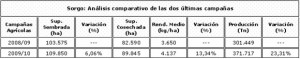 Si bien, al inicio de campaña se previa mayor aumento en las hectáreas dedicadas al cultivo de sorgo, debido a la disminución del área de maíz, al no concretarse esta última hizo que el sorgo tuviera un leve incremento de superficie.