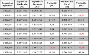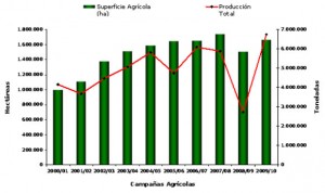 Se puede apreciar por un lado el incremento sistemático del área en los cinco primeros años y la relativa estabilidad a partir de la campaña 2005/06.