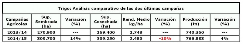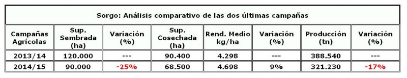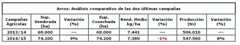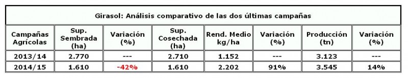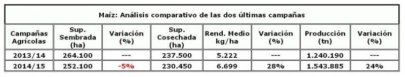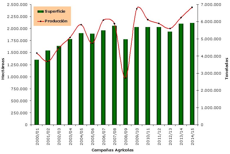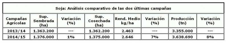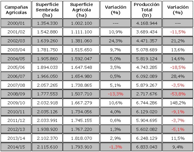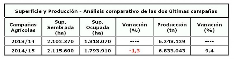 Con respecto al año pasado, se detectó una disminucion del 1,3% en el área agrícola (lo cual equivale a 24.160 ha); y la producción se incrementó en 584.914 tn, esto representó un crecimiento del 9,4%.