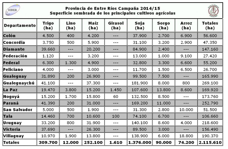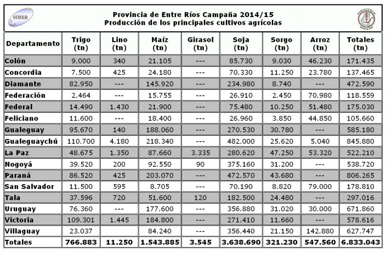 La Bolsa de Cereales de Entre Ríos en el marco del SIBER elaboró el informe de producción de los principales cultivos agrícolas de la campaña 2014/15 en la geografia entrerriana.
