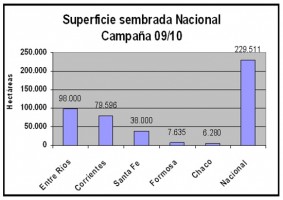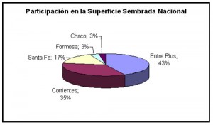 En cuanto a la distribución de la superficie nacional, Entre Ríos, con 98.000 hectáreas sembradas representa el 43% y se constituye así en la provincia que mayor área afectó al cultivo en la actual campaña. La siguen en importancia las provincias de Corrientes (35%), Santa Fe (17%), Formosa (3%) y Chaco (3%).