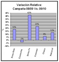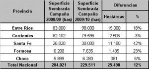 Los mayores incrementos absolutos se dieron en las provincias de Entre Ríos y Santa Fe con 15.000 y 11.180 hectáreas respectivamente, seguidas por Formosa (1.435 has) y Chaco (381 has).