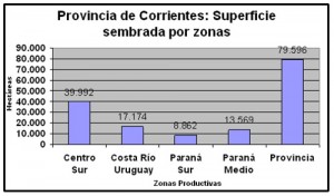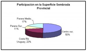 La distribución de área cultivada en la provincia presenta con respecto a la campaña anterior algunas variantes: Las zonas Paraná Medio y Paraná Sur incrementaron 4 puntos cada una, mientras que las zonas centro Sur y Costa del Río Uruguay disminuyeron 5 y 3 puntos respectivamente.