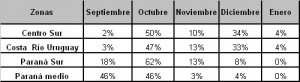 Analizando el cuadro de distribución de emergencia por zonas, se observa que los nacimientos ocurridos entre diciembre y enero corresponden en su mayor parte a las zonas Centro Sur y Costa del Río Uruguay.