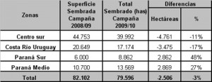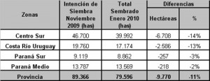 Por otro lado, si tomamos como referencia la intención de siembra que habían manifestado los productores en el mes de noviembre del 2009 y lo comparamos con el total de hectáreas sembrado en la actual campaña, observamos que no se logró sembrar en la provincia 9.770 hectáreas (11% de la intención Nov´09), y que la mayoría de estas hectáreas pertenecen a las zonas Centro Sur y Costa del Río Uruguay.