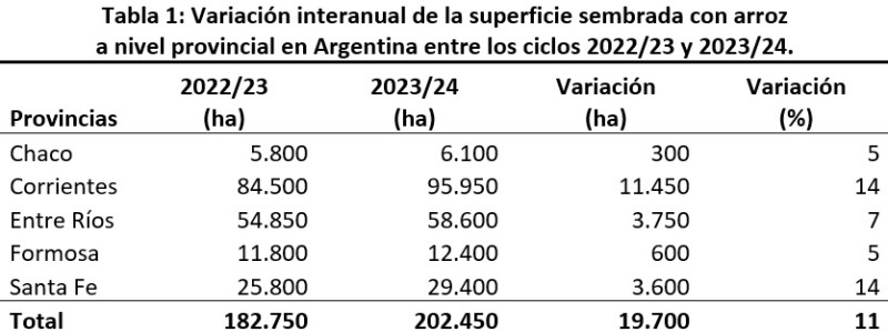 La superficie sembrada con Arroz en Argentina en el ciclo 2023/24 fue de 202.450 ha, por lo tanto, se registró un crecimiento interanual del 11 % (19.700 ha).