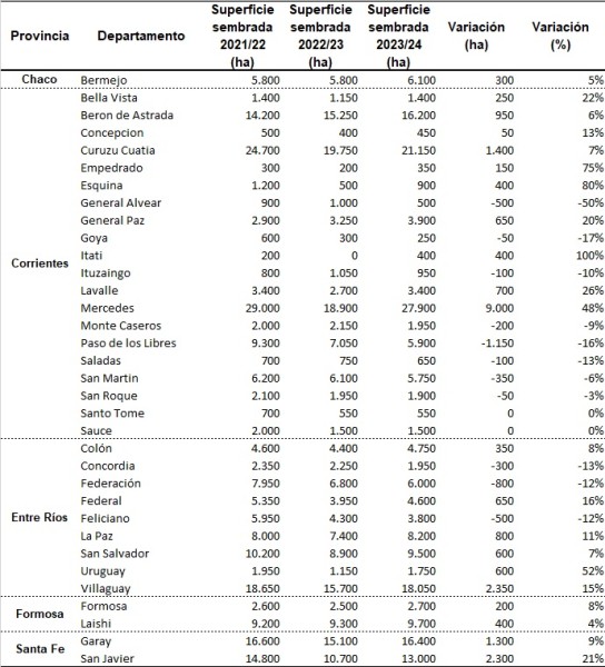 Cabe destacar que en todas las provincias se detectó un incremento del área dedicada al arroz, aunque se destaca la provincia de Corrientes con un aumento de 11.450 ha.