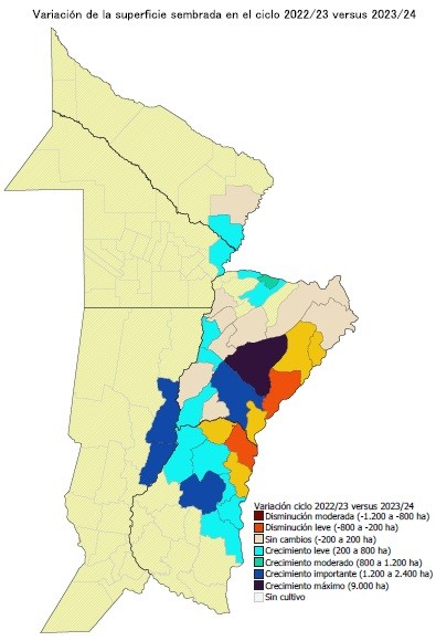 En la Tabla 2 se detalla la variación de la superficie sembrada a nivel departamental entre el ciclo 2022/23 versus 2023/24 en Argentina.