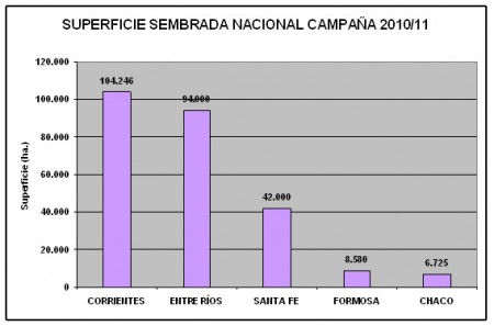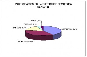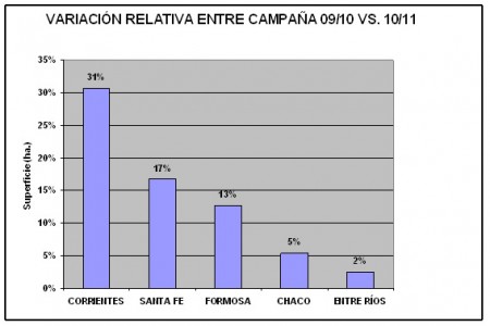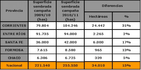 Comparando el área sembrada en cada una de las provincias, se observa que los mayores incrementos absolutos se dieron en Corrientes con 24.442 has., Santa Fe y Entre Ríos con 6.000 y 2.265 hectáreas respectivamente, seguidas por Formosa con 965 has. y la provincia del Chaco con 339 has. más.