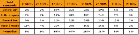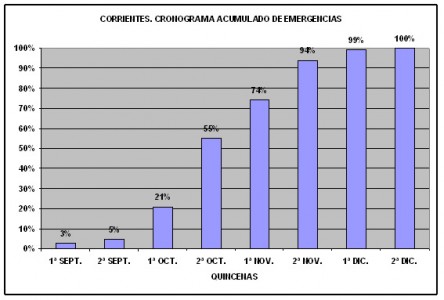 En lo que respecta al cronograma de nacimientos, se observa que a nivel provincial el 55% de la superficie relevada ya se encontraba emergida para la segunda quincena de octubre y teniendo para la segunda quincena de noviembre un 94% emergido.