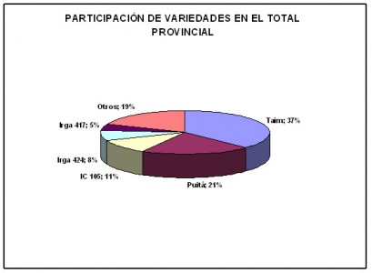 Con respecto a las variedades, sigue siendo Taim con el 37% la variedad más utilizada a nivel provincial; manteniéndose constante en el porcentaje de intervención con respecto a la anterior campaña, lo siguen Puitá con el 21%, IC 105 con el 11%, Irga 424 con un 8% y Supremo 13 continúa descendiendo, en esta campaña se presenta con el 4%.